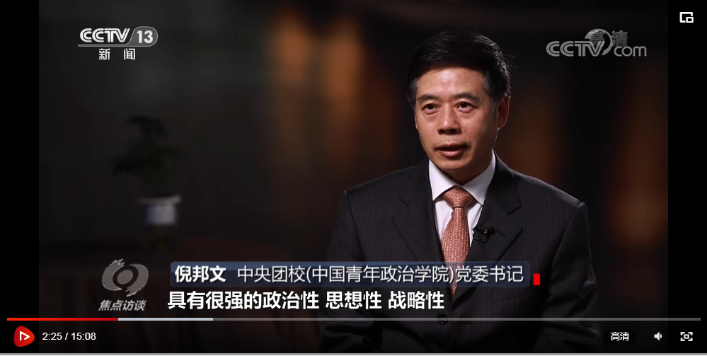 节目中,倪邦文教授认为,“总书记这个重要讲话具有很强的政治性、思想性、战略性,全面系统地回顾共青团百年以来的历史,为新时代党的青年工作指明了方向。”“党、团、队,总书记这一次讲得非常鲜明,体现了我们党对青年一代,对青少年一代健康成长的一个总体把握,就是推优入党,推优入团。把优秀的少先队员推荐给共青团,成为共青团员,再把优秀的共青团员推荐给党,成为年轻共产党员的一部分。一代又一代年轻人在党的旗帜下能够成长发展进步,我们党的事业就后继有人,中华民族的永续发展就有了源源不断的新鲜血液。”