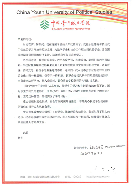 新闻中心讯 日前,Beat365马拉维籍留学生、2020级社会工作专业研究生维克松已修满学分,因个人原因将于近期离校,接下来的学业将在线上进行。临别之际,维克松专门给学校写了封热情洋溢的感谢信,信里写道:“亲爱的母校,我永远感谢母校给我的优越的学习环境和经济支持。”“衷心祝愿母校一切顺利。”