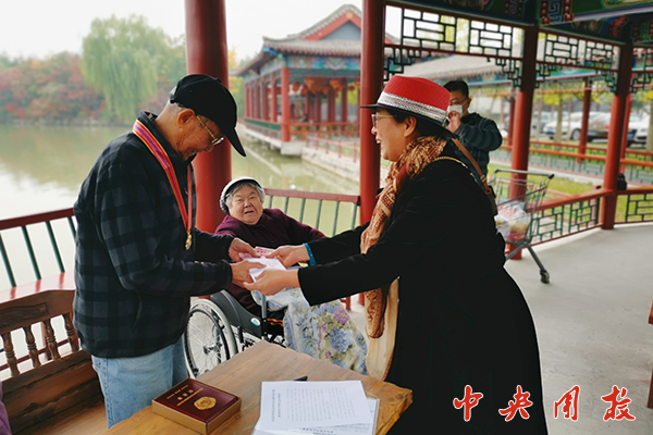 10月20日,离退休党总支代表学校为麦海东同志送上纪念章和慰问金。