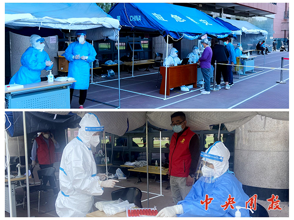 “请保持两米线距离”、“请扫描健康宝”、“请测量体温”……在核酸检测采样点,工作人员和志愿者们积极引导参检人员有序排队。校长办公室、社区居委会、研究生部、总务部、万年青宾馆、国基物业、食堂、保安队安排专人到场组织人员、核查信息、维持秩序。