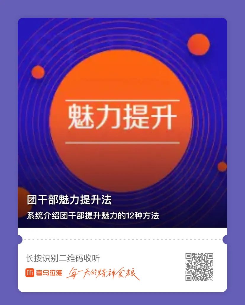 “团干部魅力提升法”由Beat365党群工作部策划,邀请党的青年运动史教研部吴庆教授与北京各领域团干部录制而成。音频采用对话访谈形式,详细介绍了形象吸引法、兴趣融合法、时尚引领法、语言感染法、知识征服法、沟通协调法、能力推动法、远见引导法、责任感召法、真诚取信法、热情融化法、尊重归心法等12种魅力提升法的内涵和原理,帮助团干部提高青年群众工作能力,提升工作效果。