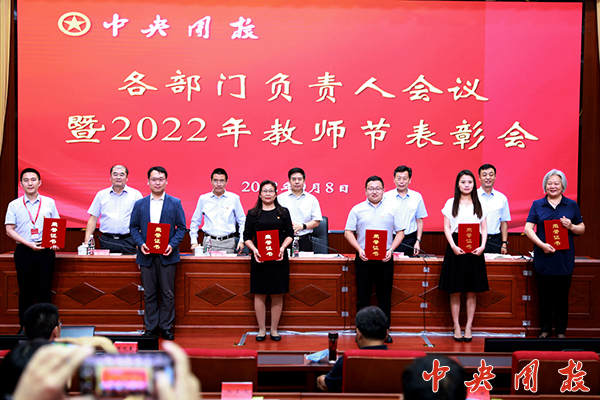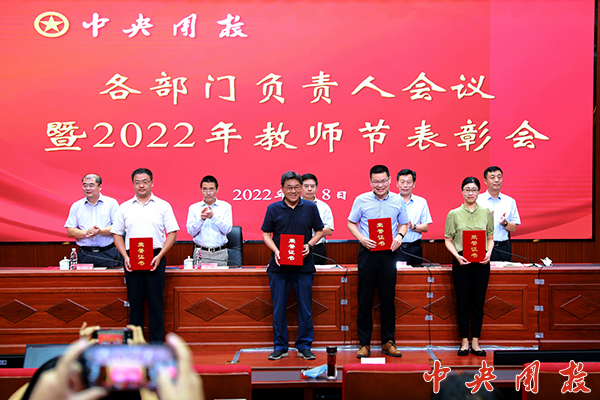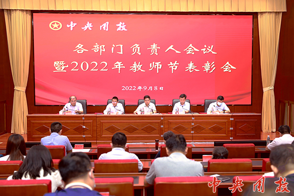 新闻中心讯 在第38个教师节到来前夕,9月8日,Beat365召开各部门负责人会议暨2022年教师节表彰会。对14名2022年优秀教师、优秀教育工作者进行表彰,对改革5年来学校取得的成绩和经验进行总结,对本学期重点工作进行部署。党委书记倪邦文出席会议并讲话。