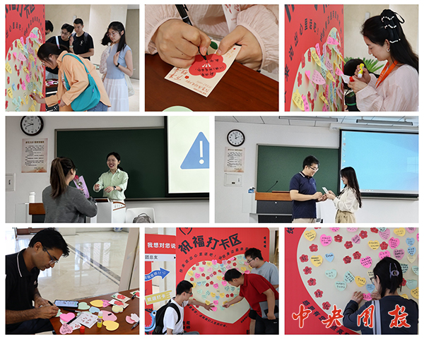 在教学楼大厅,研究生会和研究生团总支精心设计制作了祝福打卡区,同学们纷纷手写想对老师们说的话,粘贴在展示区。在教室里,同学们提前制作祝福贺卡,送给上课的老师,表达对老师们的真挚情感。