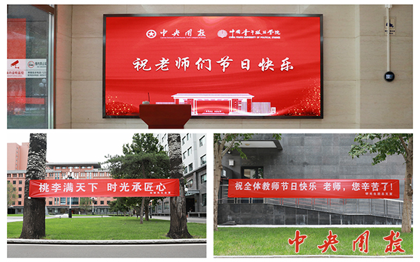 走进校园,“桃李满天下 时光承匠心”、“祝全体教师节日快乐 老师,您辛苦了!”校园里已早早挂好了祝福横幅。走进办公楼,位于一层的电子屏上,滚动播放着教师节主题海报和同学们的祝福视频,营造出浓厚的节日氛围。