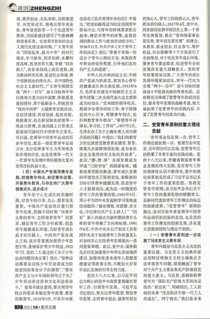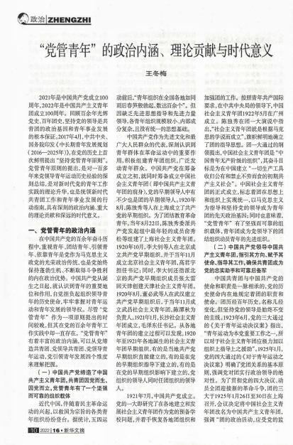 该文认为,中国共产党在百余年奋斗征程中,始终把青年工作作为党的一项极为重要的工作,在领导青年工作中积累了丰富的经验,“党管青年”是贯穿党的青年工作的政治灵魂和鲜明主线。“党管青年”有着丰富的政治内涵,可以从党缔造共青团、党领导共青团、党领导青年运动、党引领青年发展四个维度来理解把握。进入新时代,党的文件中首次明确提出“坚持党管青年原则”。这一原则的提出,进一步从根本上揭示了党与团、党与青年关系的本质内核,丰富和发展了马克思主义青年观,标志着党的青年工作理论更加成熟。坚持党管青年原则,是新时代共青团工作和青年工作沿着正确方向推进的根本保证,对于团结组织动员广大青年向着第二个百年奋斗目标、向着中华民族伟大复兴迈进具有重大意义。