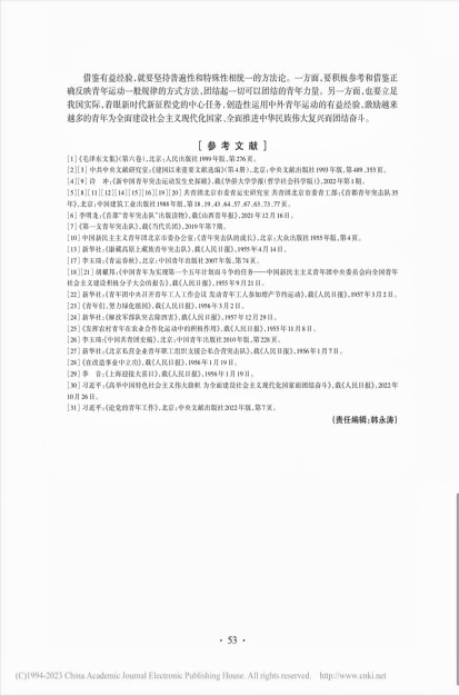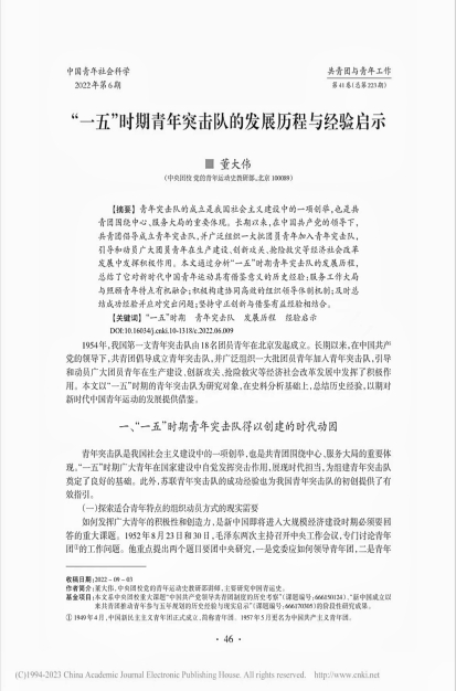 我系教师董大伟在《中国青年社会科学》2022年第6期发表学术论文《“一五”时期青年突击队的发展历程与经验启示》。该文认为,青年突击队的成立是我国社会主义建设中的一项创举,也是共青团围绕中心、服务大局的重要体现。长期以来,在中国共产党的领导下,共青团倡导成立青年突击队,并广泛组织一大批团员青年加入青年突击队,引导和动员广大团员青年在生产建设、创新攻关、抢险救灾等经济社会改革发展中发挥积极作用。“一五”时期的青年突击队对新时代中国青年运动具有重要借鉴意义:服务工作大局与照顾青年特点有机融合;积极构建协同高效的组织领导体制机制;及时总结成功经验并应对突出问题;坚持守正创新与借鉴有益经验相结合。