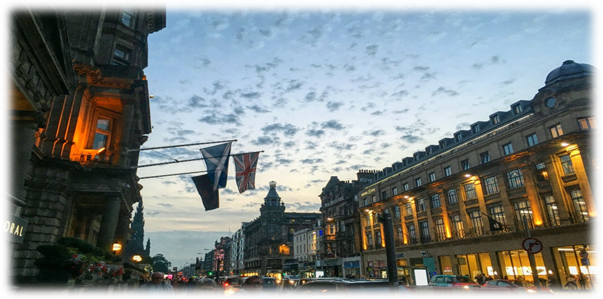 爱丁堡最有名的一条街是Royal Mile,尽头是爱丁堡城堡,另一头是荷里路德宫,女王夏天访问英格兰或者避暑都是住在这里面的。另一条有名的街是Prince Street王子街。王子街处于爱丁堡城中心,街上大多是购物的地方,爱丁堡Waverley火车站就在王子街街旁。