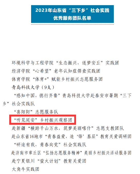 近日,2023年“调研山东”——暑期“三下乡”社会实践活动评优结果公布,经管学子奋楫扬帆,赓续前行,获多项荣誉。营销221班李兴荣获评“优秀学生”,“听见延安”乡村振兴观察团获评“优秀服务团队”。