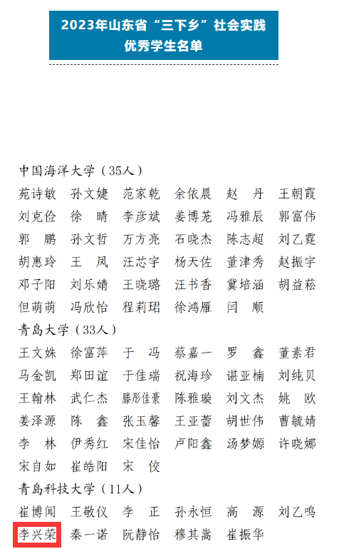 据悉,2023年暑期,团省委联合省委宣传部、省文明办、省教育厅等单位以“学习二十大 永远跟党走 奋进新征程”为主题,广泛组织动员全省大中专院校青年学生参加“调研山东”——暑期“三下乡”社会实践活动,深入学习宣传贯彻习近平新时代中国特色社会主义思想,引导和帮助青年学生在与现实相结合的“大思政课”中受教育、长才干、作贡献,以满怀的青春朝气和锐气,投身新时代社会主义现代化强省建设。为深入总结交流经验、激励广泛参与、发挥育人实效,选拔出一批在2023年暑期“三下乡”社会实践活动中表现突出的优秀集体、个人和项目。经基层申报、审核推荐、组织评议等环节,最终确定80个优秀组织单位、1130名优秀指导教师、2180名优秀学生、520个优秀服务团队、100个优秀服务基层实践项目。