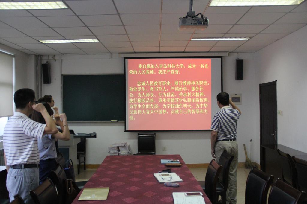 之后,六名新进教师在王志宪的领誓下,面对国旗,庄严的宣誓:我自愿加入青岛科技大学,成为一名光荣的人民教师,我宣誓:忠诚人民教育事业,履行教师神圣职责,敬业爱生,教书育人,严谨治学。服务社会,为人师表,行为世范。传承科大精神,践行橡胶品格,秉承明德、笃学、弘毅、拓新校训,为学生全面发展,为学校灿烂明天,为中华民族伟大复兴中国梦,贡献自己的智慧和力量。